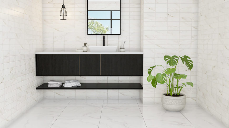 Os azulejos de grandes dimensões — que reduzem juntas e criam superfícies mais contínuas — ganham espaço tanto em paredes quanto em pisos. Essa tendência traz sensação de amplitude e elegância, sendo perfeita para ambientes modernos e minimalistas.