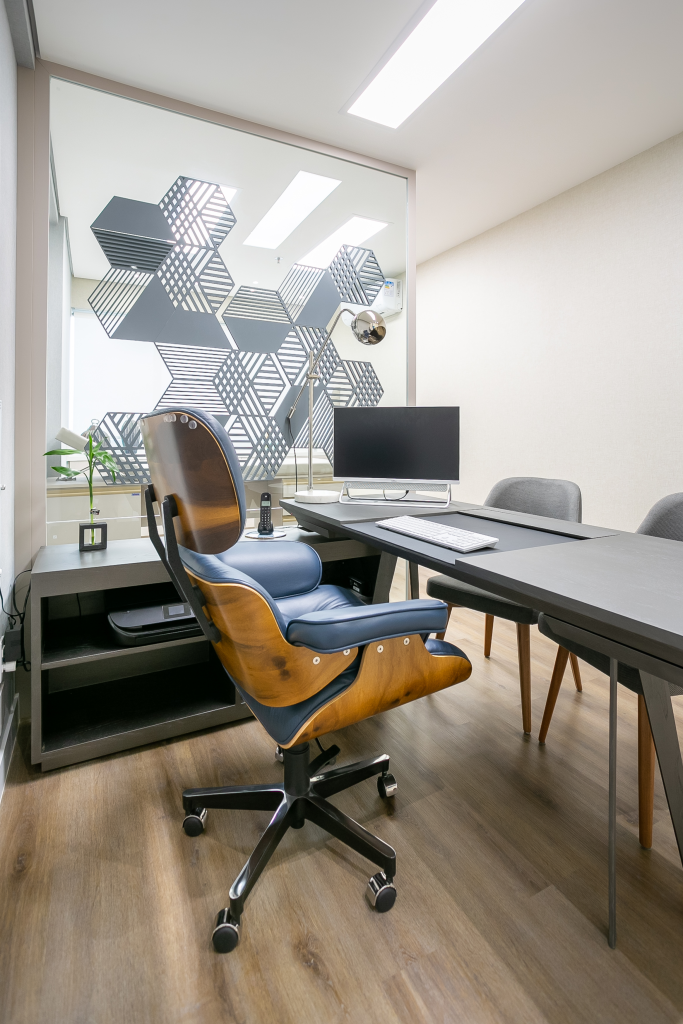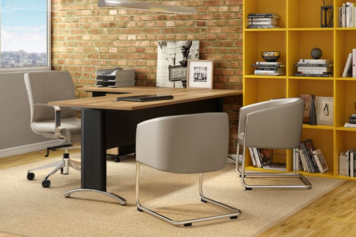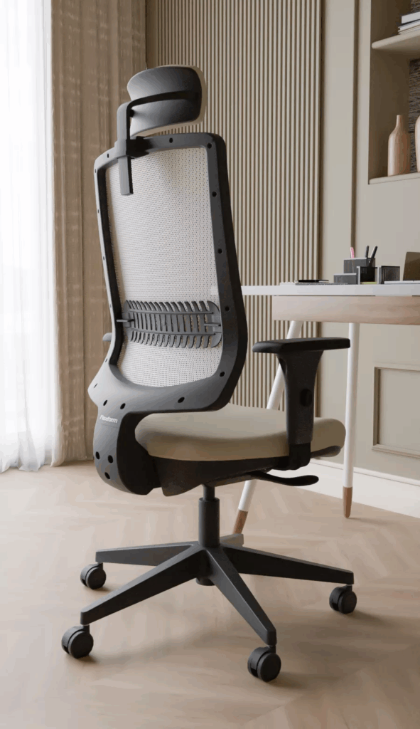 O design minimalista e sofisticado domina os escritórios de 2026. As cadeiras assumem linhas mais leves, com bases compactas e acabamentos elegantes em tons neutros (preto, cinza, bege, grafite) ou sofisticados (bronze, metal fosco, couro ecológico). Mais do que móveis funcionais, elas se tornam peças de design que dialogam com o estilo do ambiente.