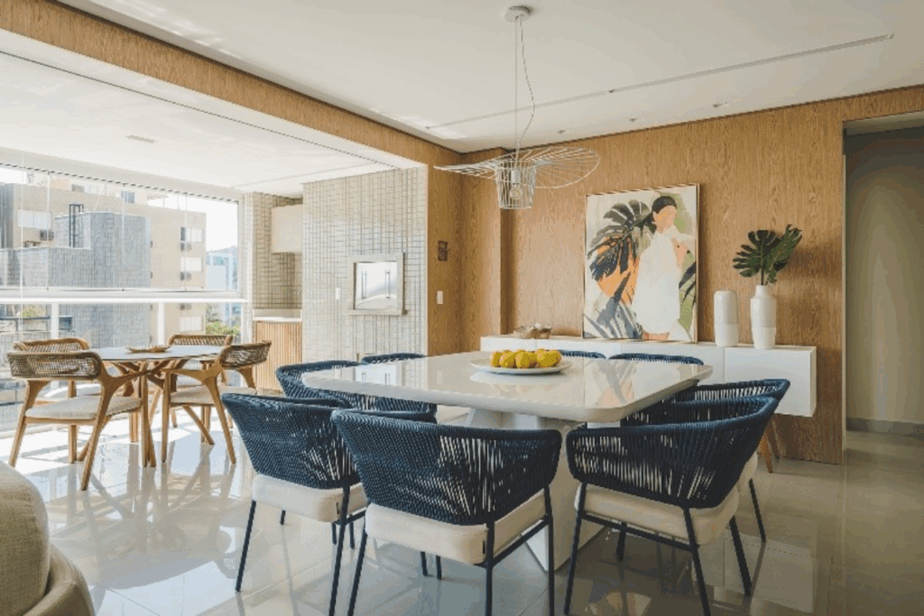 Teletrabalho e novas dinâmicas familiares impulsionaram a demanda por espaços multifuncionais. Em um conceito de design de interiores orientado para o futuro, áreas como home offices que se transformam em espaços de lazer são essenciais. Por exemplo, uma mesa de escritório pode ser projetada para se transformar em uma mesa de jantar, ou uma cama embutida que se recolhe para revelar uma parede com equipamento de ginástica. Esse tipo de solução é especialmente benéfica para quem vive em apartamentos pequenos ou espaços urbanos reduzidos, onde cada metro quadrado conta.
