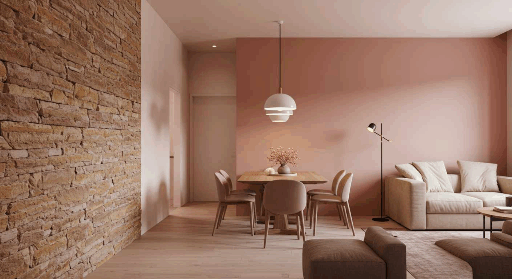 Por exemplo, em uma sala de estar, um sofá de veludo verde profundo pode ser destacado por almofadas de linho bege e uma manta de lã marrom. Em um quarto, roupa de cama de algodão em tons terrosos pode ser complementada por uma cabeceira de couro, somando uma camada extra de elegância e conforto. Áreas como cozinhas e banheiros também podem se beneficiar dessas combinações; azulejos texturizados e armários pintados em tons naturais podem transformar esses espaços, tornando-os não apenas funcionais, mas visualmente convidativos.