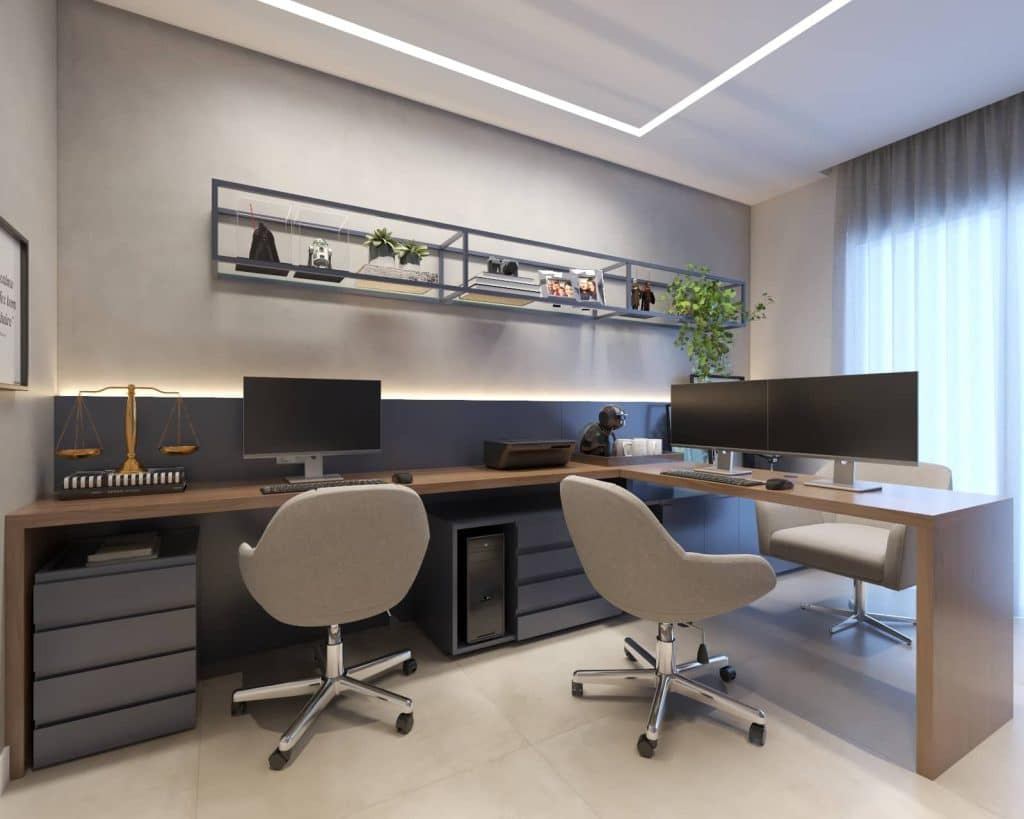 As cores claras e os tons neutros vão proporcionar um ambiente mais confortável para os seus olhos e evitar o cansaço visual, aumentando a produtividade e diminuindo o estresse.
